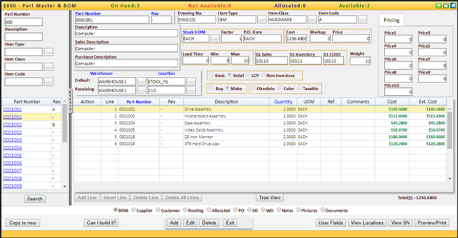 AMICS Part Master and BOM is where the part numbers and multi level BOM are created. Additional screens for inventory management are included in inventory module